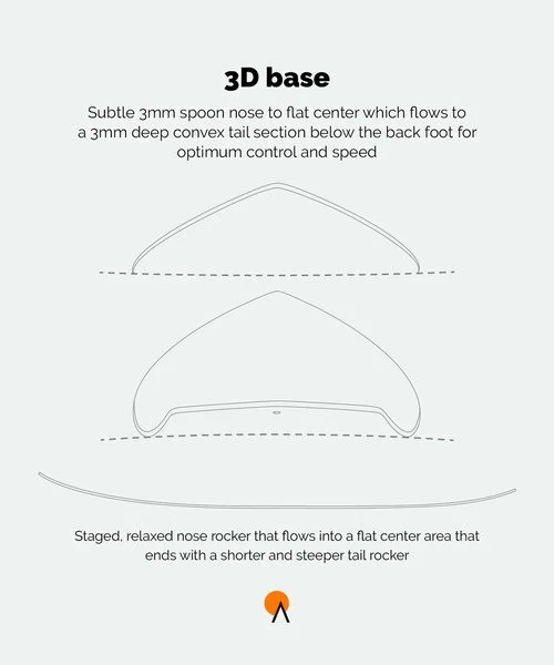 3D base: Subtle 3mm spoon nose to flat center which flows to a 3mm deep convex tail section below the back foot for optimum control and speed.